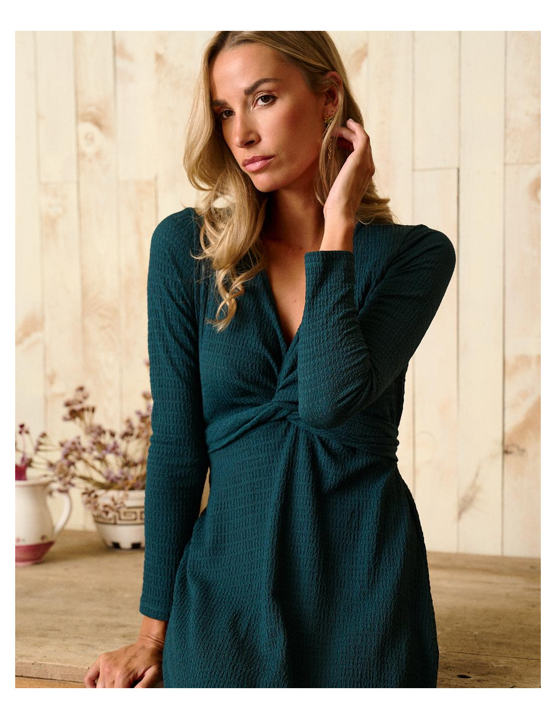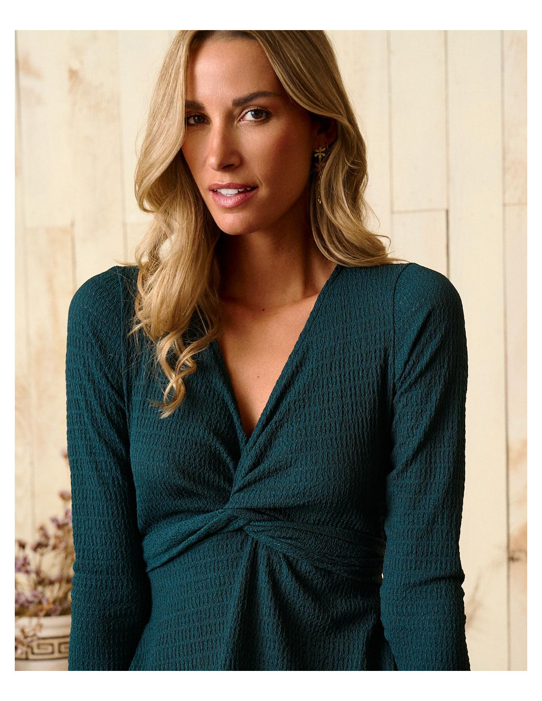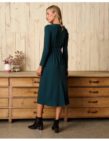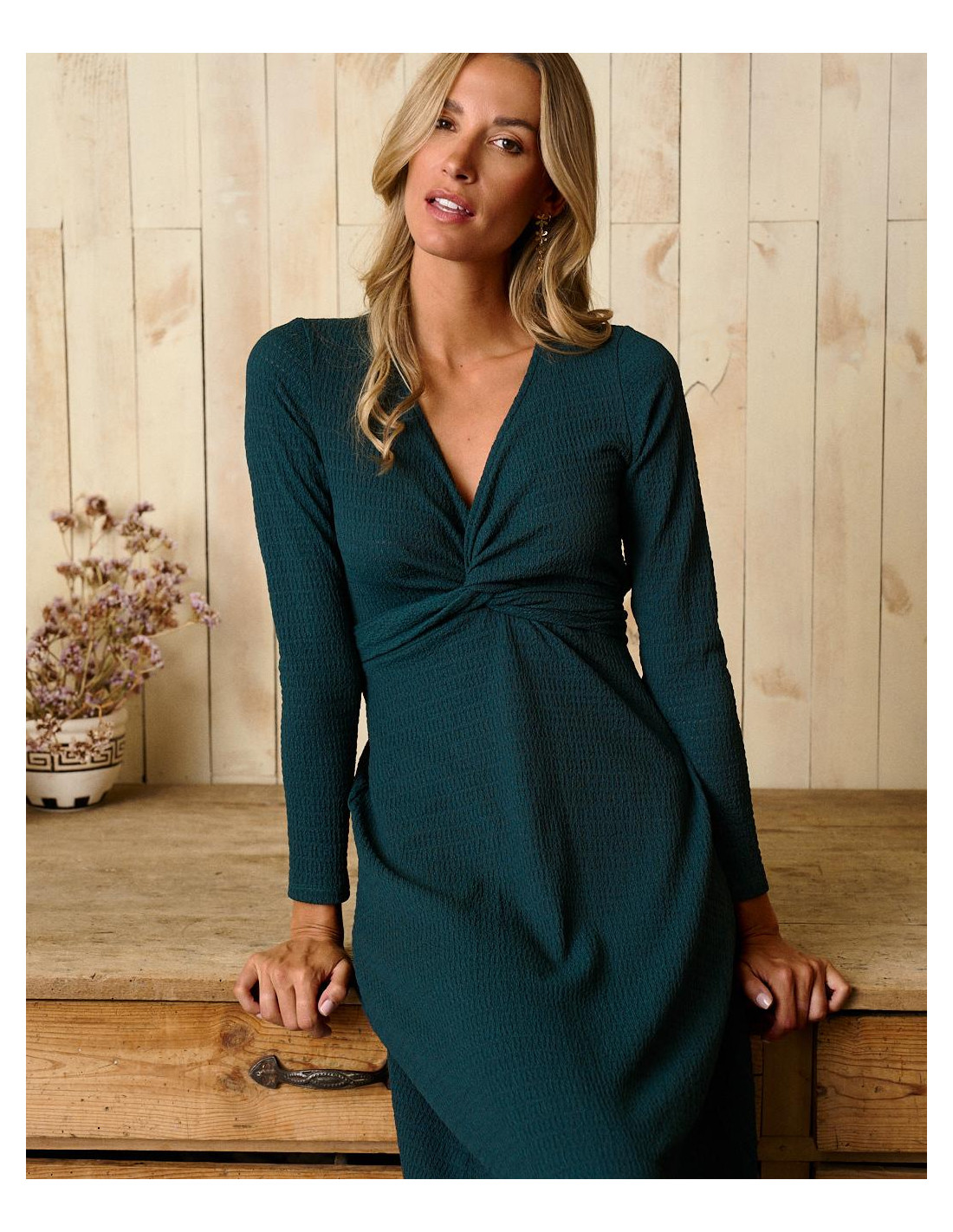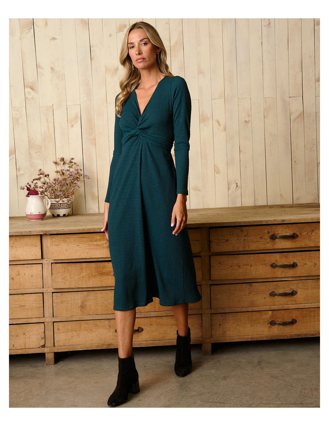 <p><span style="font-size: 10pt; font-family: Arial;">Vestido midi de punto en color verde bosque, con un favorecedor escote en pico y un detalle de nudo en la cintura que realza la figura. Las mangas son largas y el diseño ajustado en la parte superior y la falda de corte evasé crean una silueta muy femenina.</span></p>